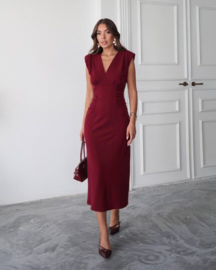 Crasia Kadın V Yaka Büzgü detaylı Midi Boy Bordo Elbise