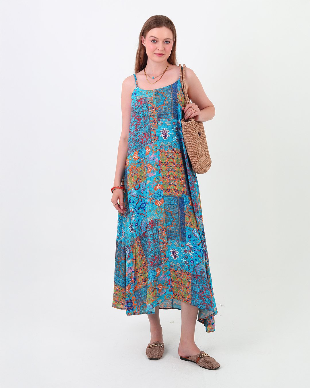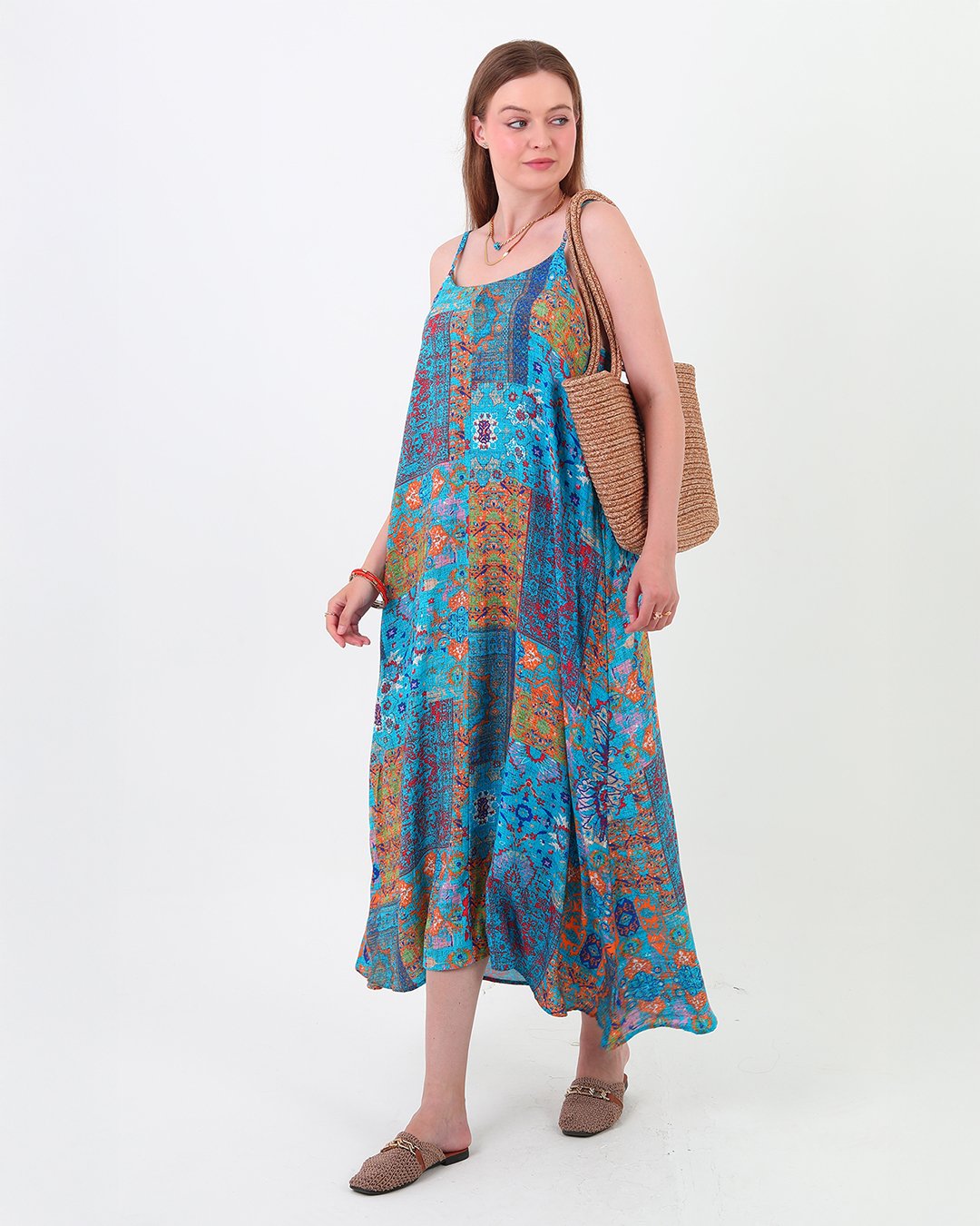Kolsuz viskon elbise, esnek askıları ve comfort kalıbıyla günlük kullanım için ideal. Salaş ve zarif tasarımı, yaz aylarında serin ve şık bir görünüm sunar.