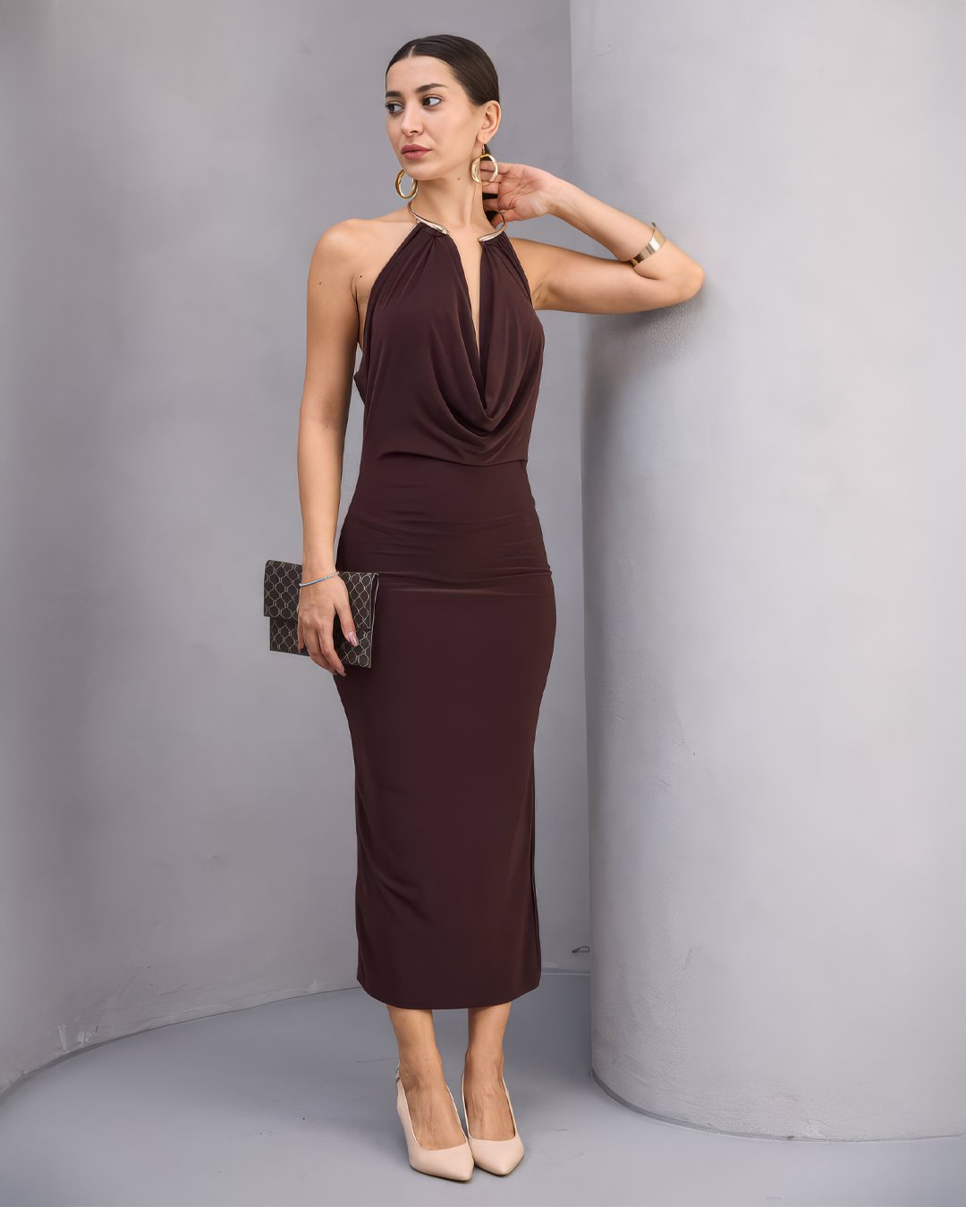 Crasia Kadın Drapeli Bordo Uzun Elbise