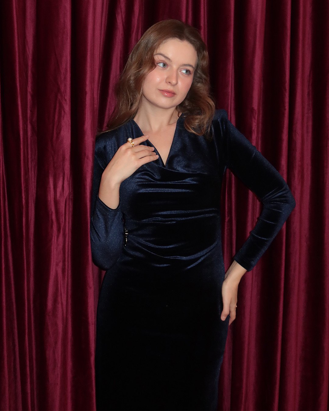 Crasia Kadın V Yaka Büzgü detaylı Midi Boy Lacivert Elbise