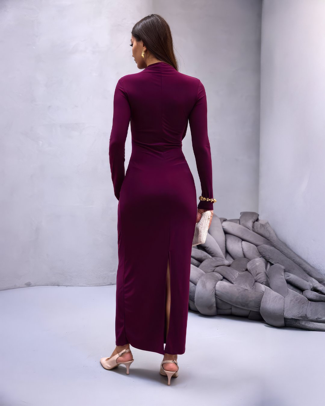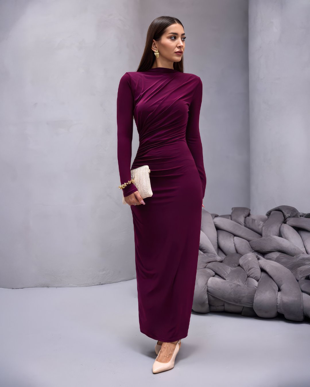 Crasia Kadın Drapeli Mürdüm Uzun Elbise