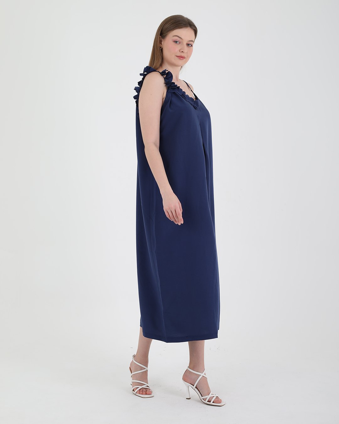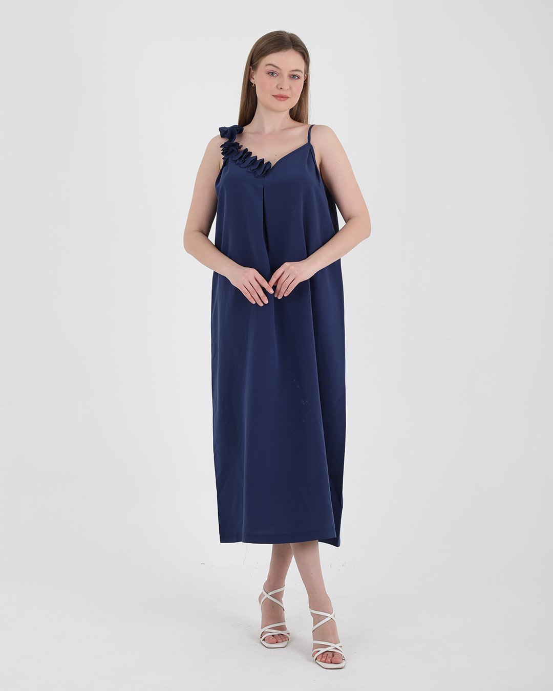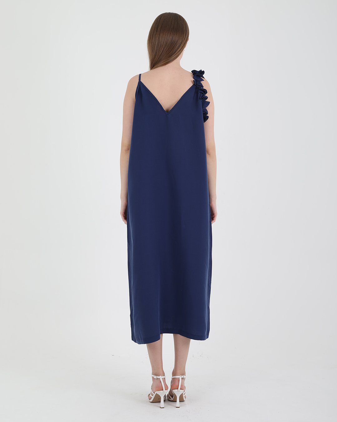 Crasia Kadın Gül Detaylı V Yaka Lacivert Midi Elbise