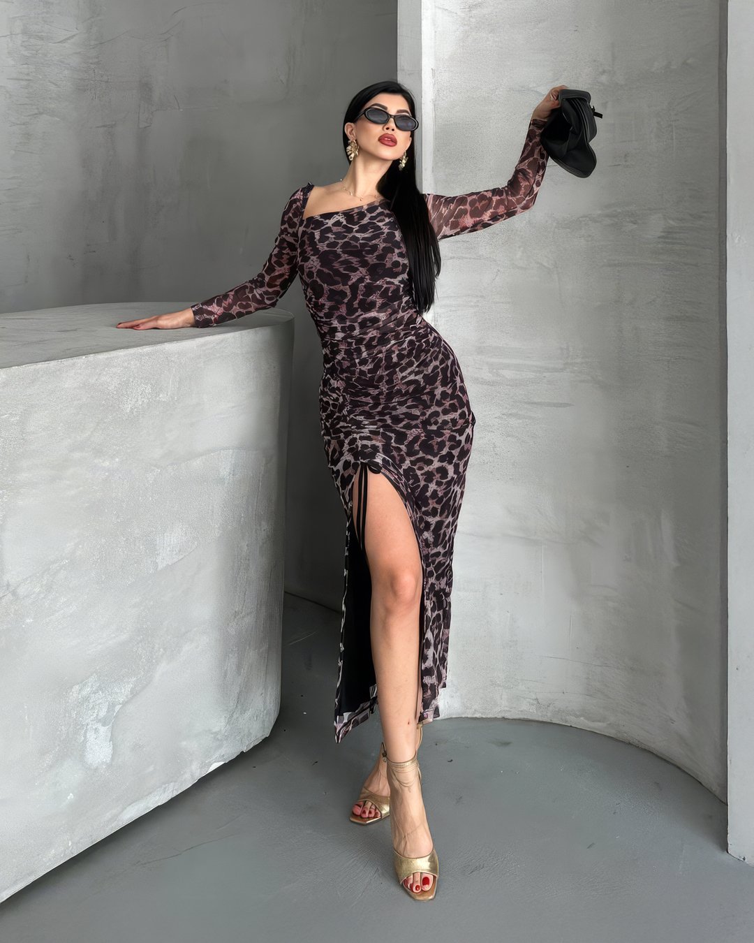 Crasia Kadın Leopar Tül Düşük Omuzlu Midi Boy Elbise