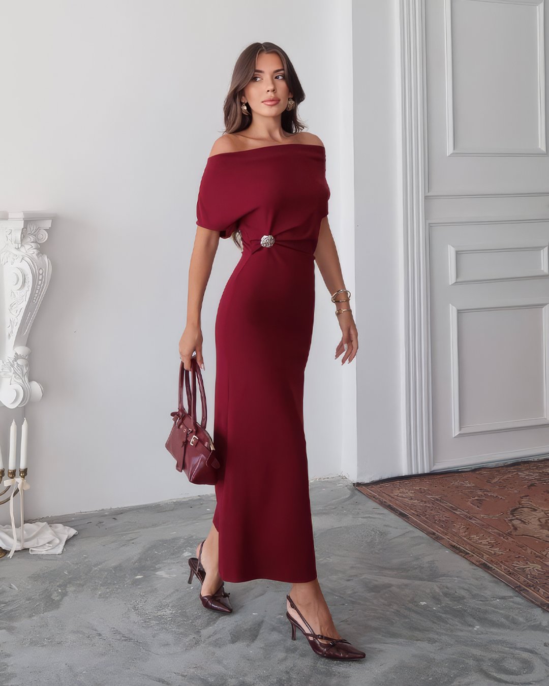 Crasia Kadın Midi Boy Yaka Detaylı Bordo Elbise