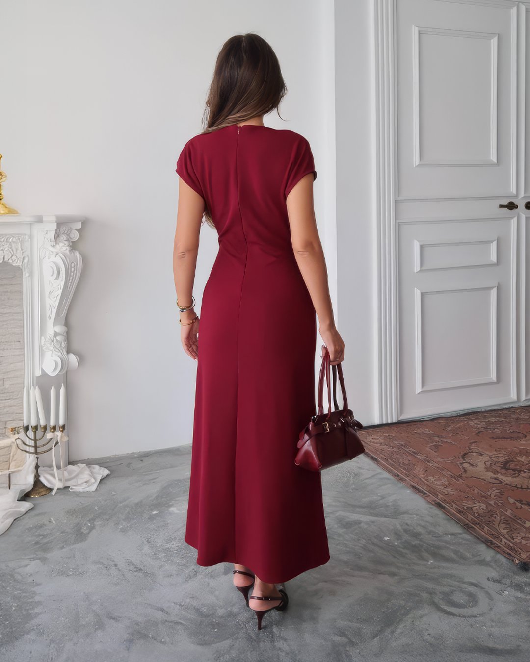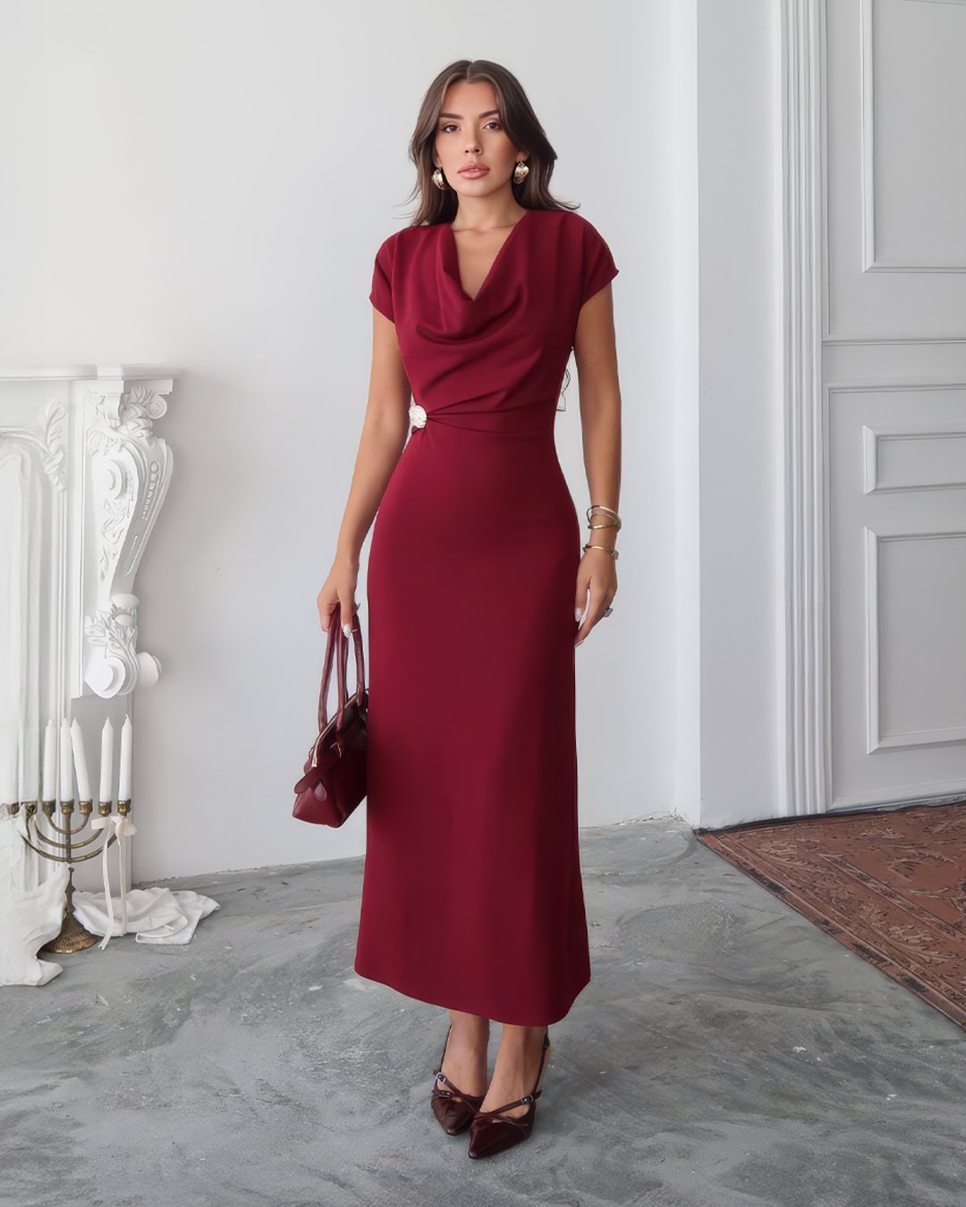Crasia Kadın V Yaka Büzgü detaylı Midi Boy Bordo Elbise