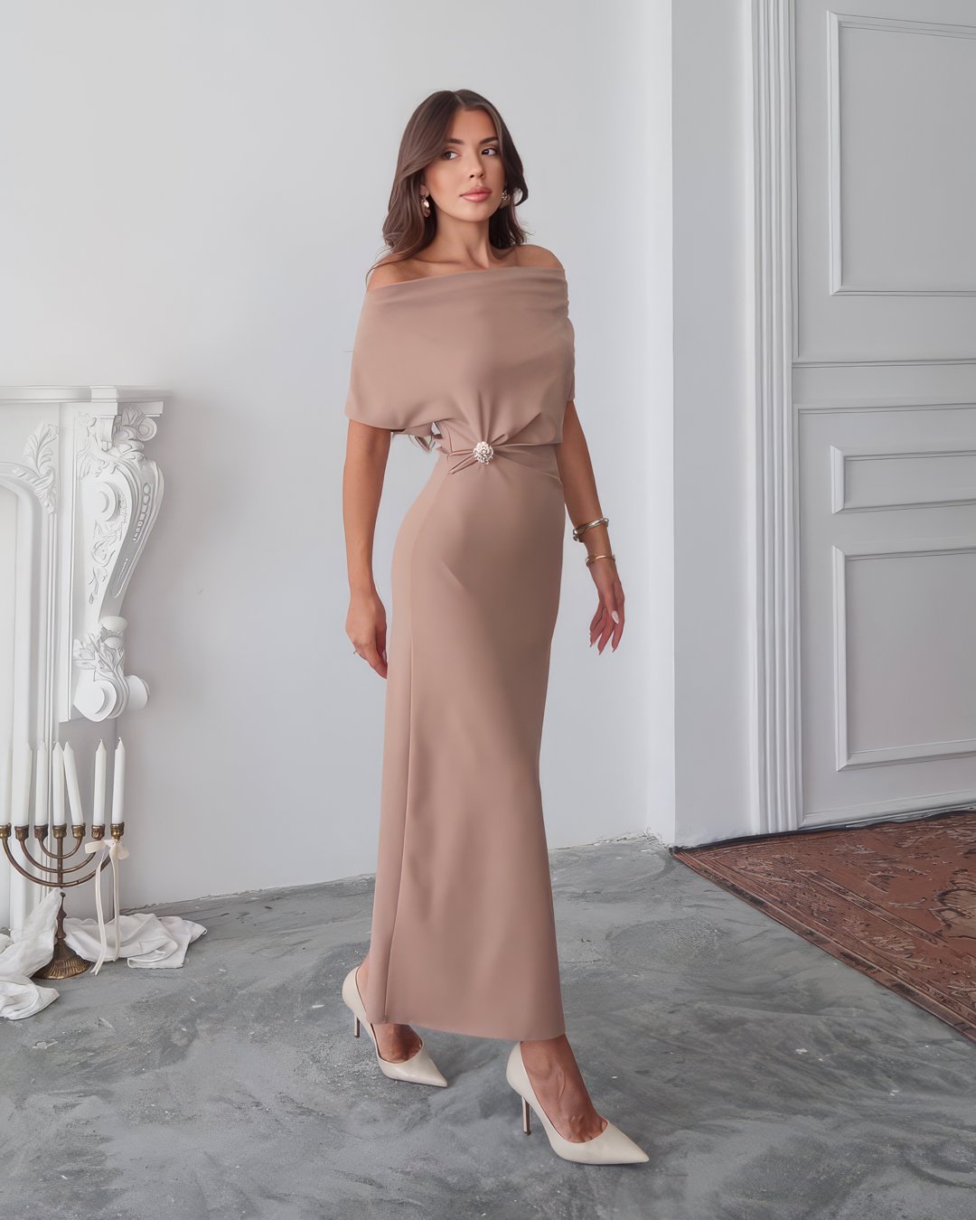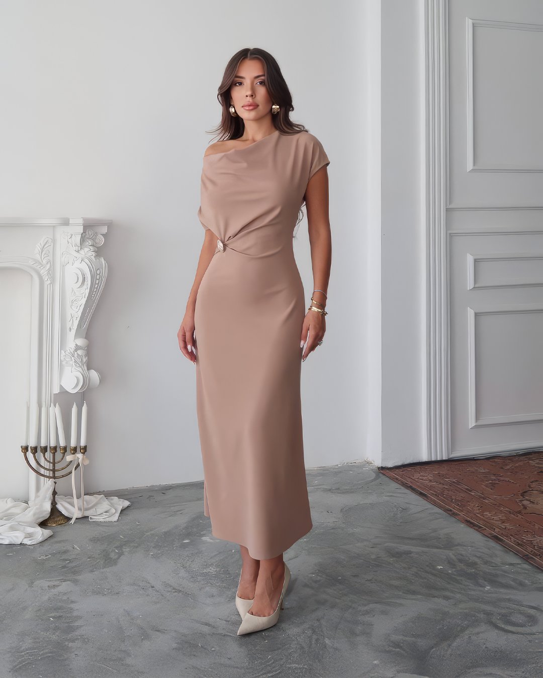 Crasia Kadın Geçmeli Tokalı Kruvaze Midi Boy Kahverengi Elbise