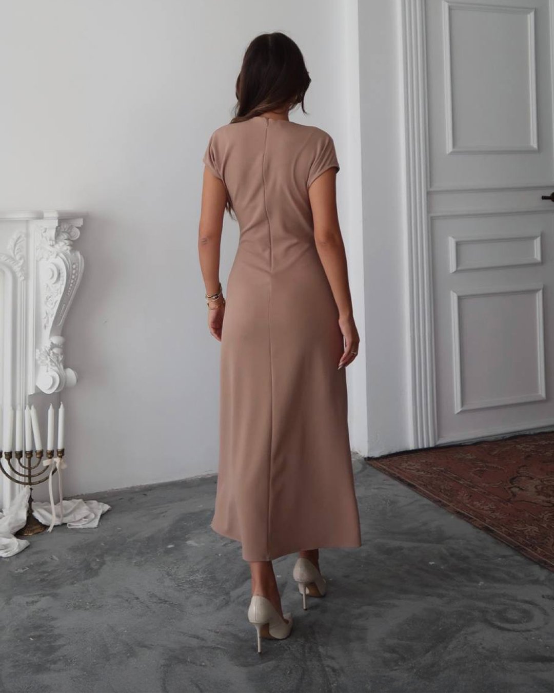 Crasia Kadın Midi Boy Yaka Detaylı Krem Elbise