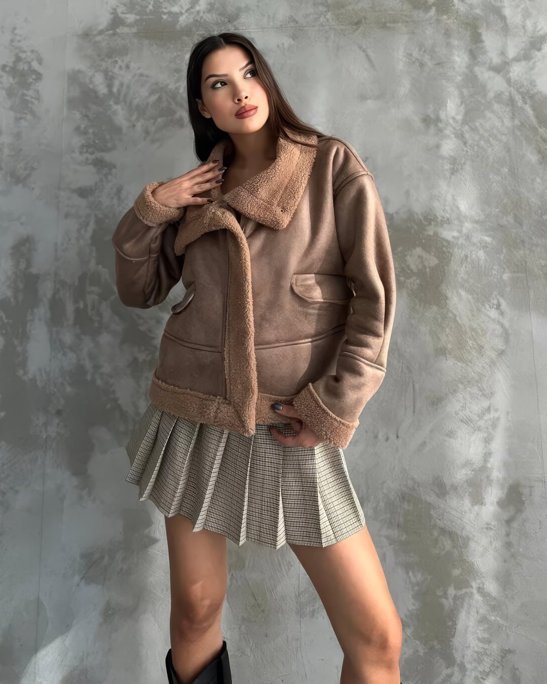 Vizon/kahverengi nubuk yaka mont, süet dokusu ve suni kürk detaylarıyla şık ve sıcak bir görünüm sunar, günlük kullanım için idealdir.