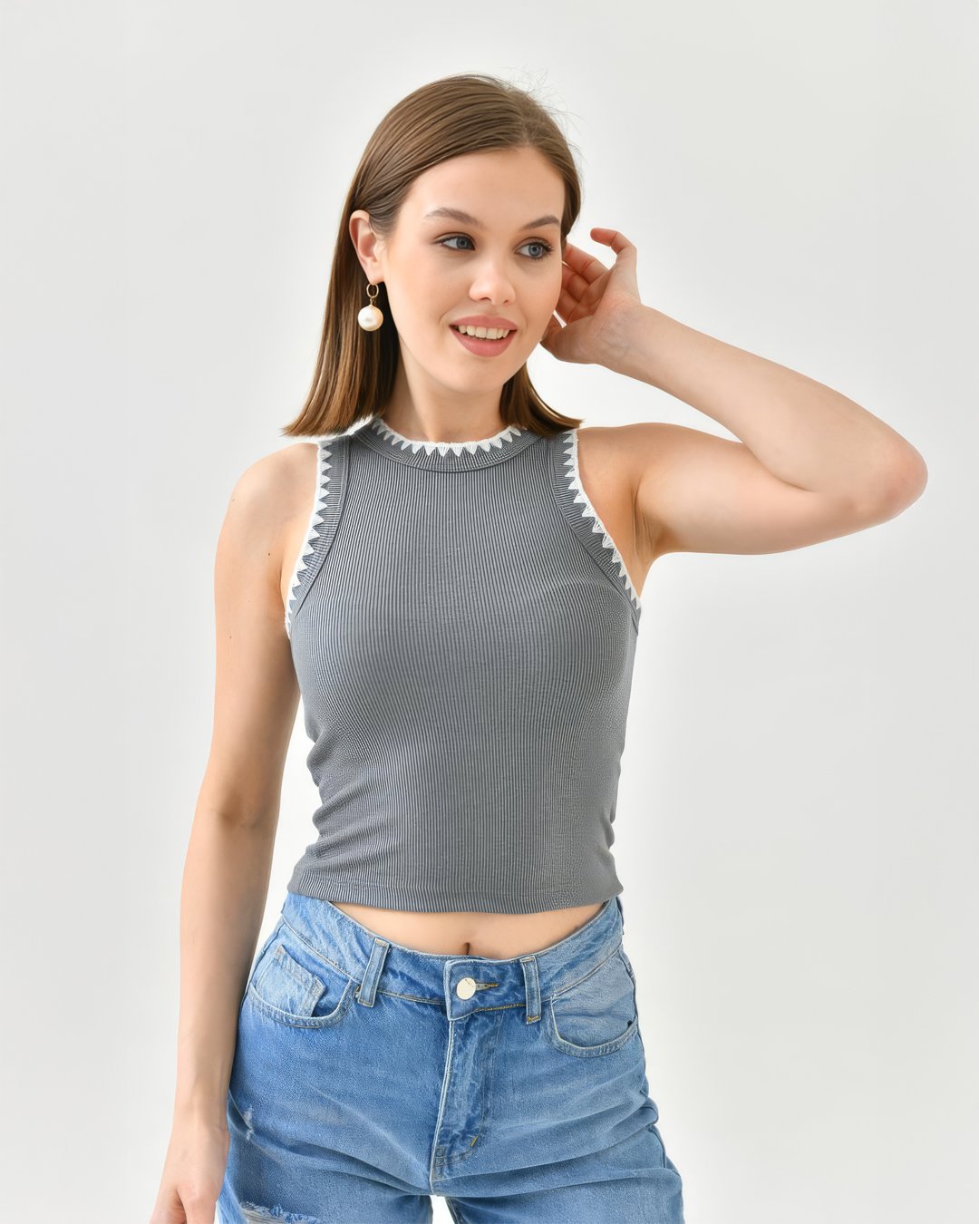 Crasia Kroşeta Dikişli Gri Atlet Crop