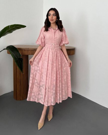 Crasia Pudra Kemerli Balon Kollu Elbise