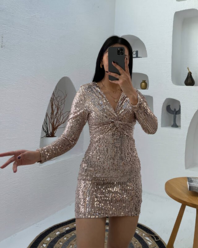 Crasia Kadın Düğüm Detaylı Pulpayet Kısa Sarı Abiye Elbise
