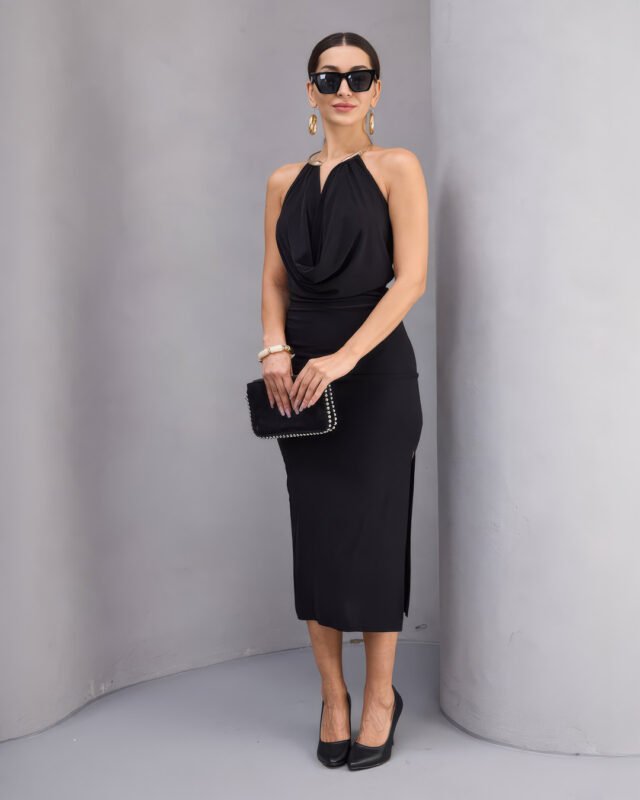 Crasia Kadın Drapeli Siyah Uzun Elbise