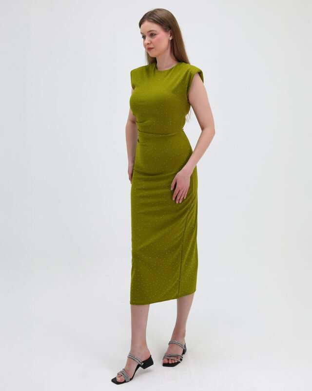 Crasia Kadın Omuz Vatkalı Belden Drapeli Işıltılı Yeşil Kalem Elbise